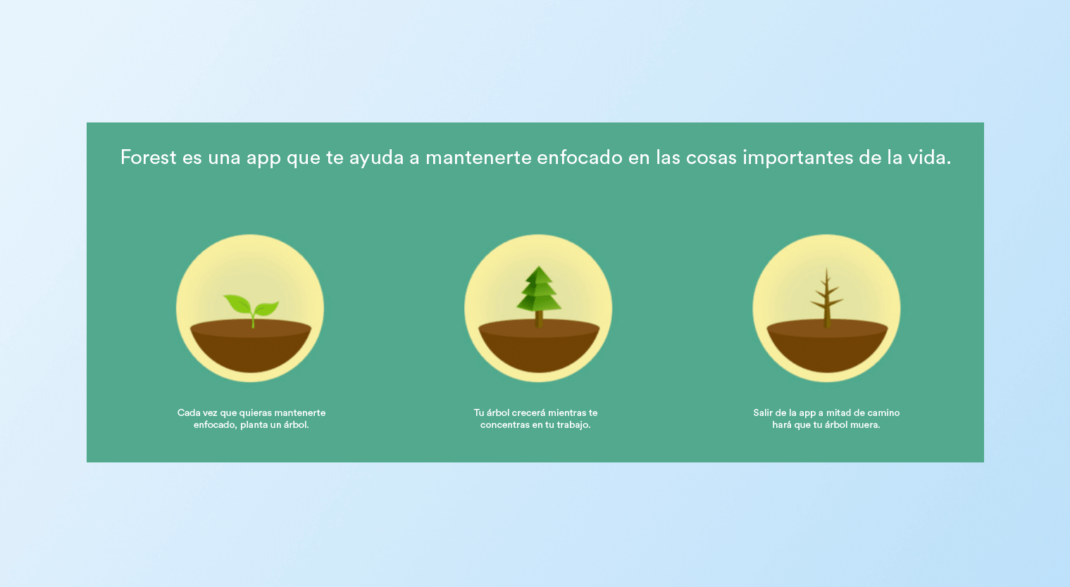 Forest fomenta la concentración haciendo crecer un árbol virtual cuando los usuarios evitan distracciones. Salir de la app mata el árbol, creando una consecuencia tangible por romper la concentración. Con el tiempo, los usuarios pueden cultivar un bosque completo que representa su productividad.