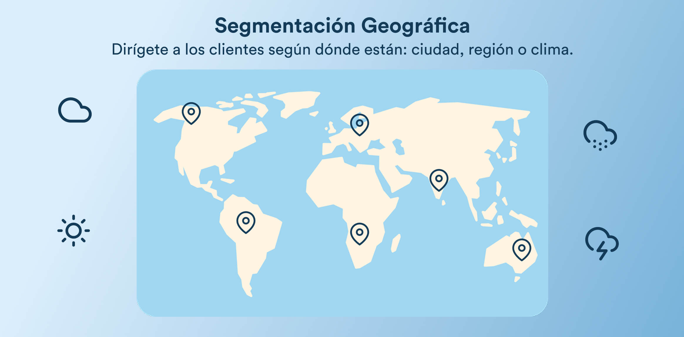 La segmentación geográfica divide a los usuarios según su ubicación, incluyendo país, ciudad, región, zona horaria o clima. Este tipo de segmentación es especialmente útil para ofertas regionales, cumplimiento local y personalización por idioma. Por ejemplo, una app de delivery podría ofrecer promociones en días de nieve en Chicago durante tormentas de invierno o destacar opciones gastronómicas específicas de la región en Nueva Orleans.