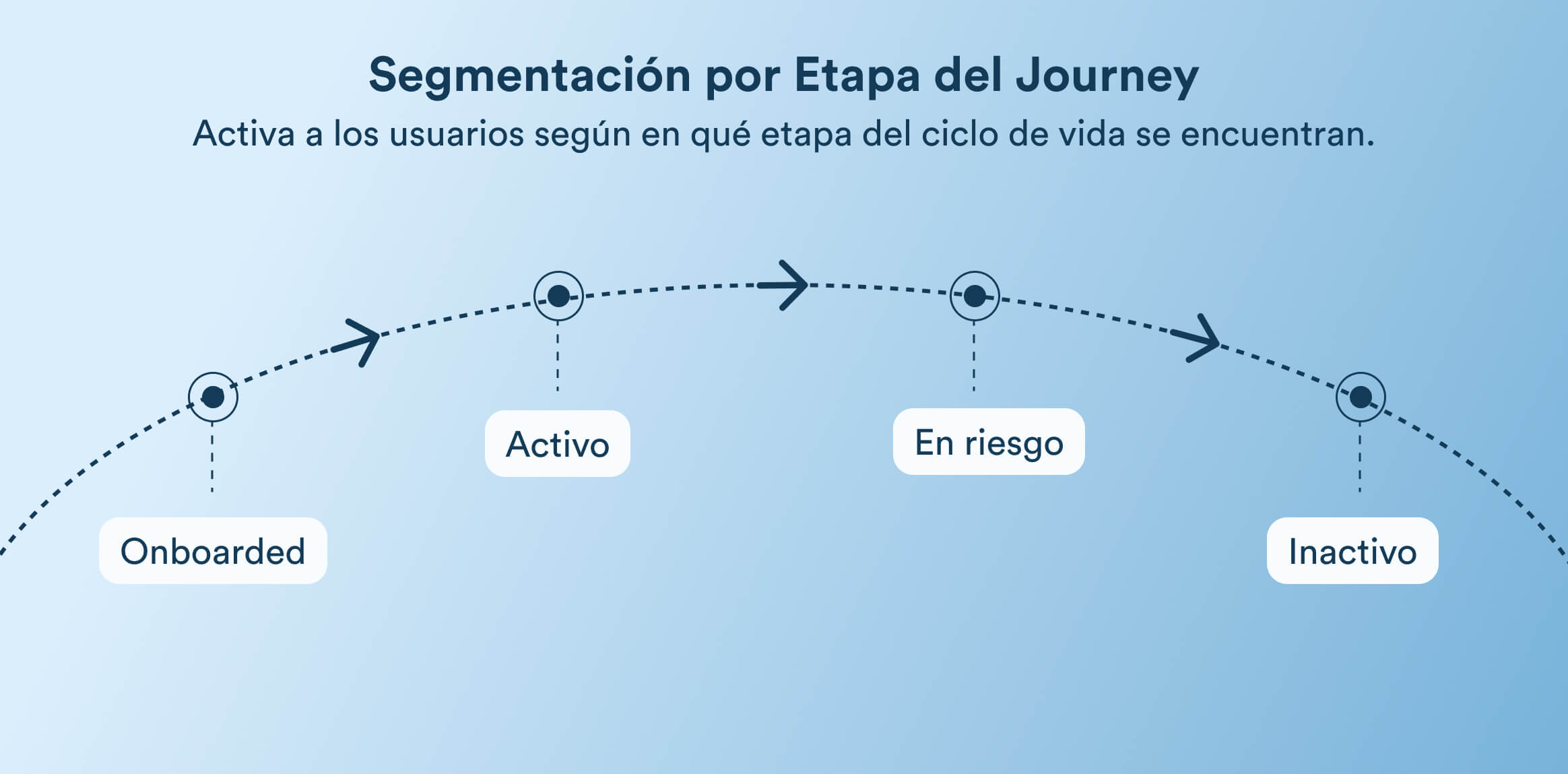 Los journeys del cliente son dinámicos. Los usuarios pasan del onboarding a la adopción, y de la inactividad a la reactivación. La segmentación por etapa del journey identifica en qué fase se encuentra cada usuario y ajusta la comunicación en consecuencia.