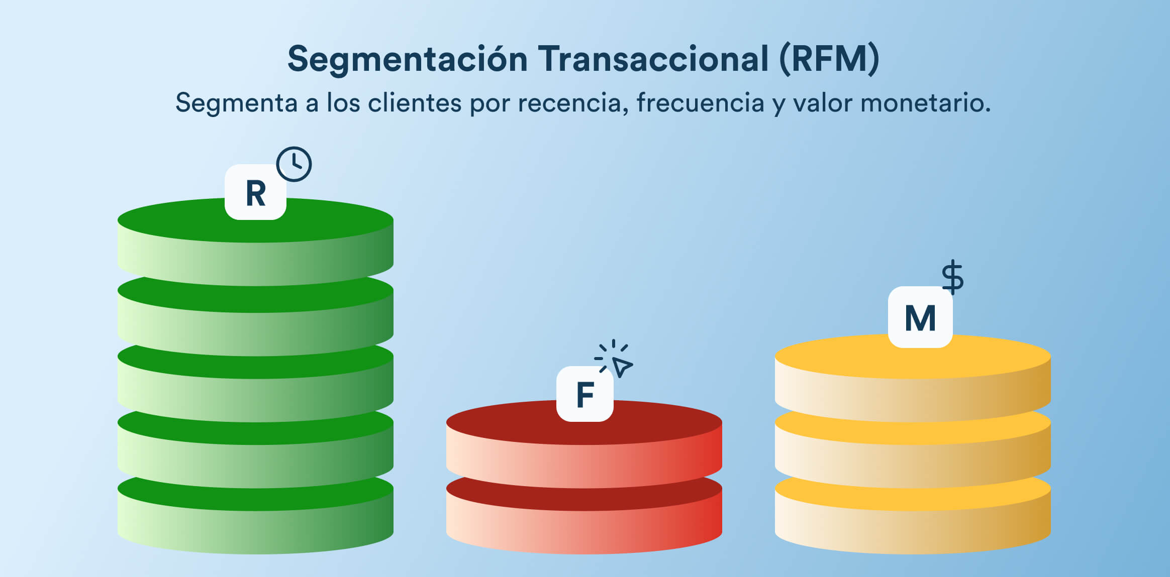 La segmentación transaccional se centra en cómo los usuarios interactúan financieramente con tu producto. Esto incluye cuán reciente fue su última compra, con qué frecuencia compran y cuánto suelen gastar, como se explica en el framework RFM de CleverTap. Estas dimensiones conforman lo que comúnmente se conoce como segmentación RFM: Recencia, Frecuencia y Valor Monetario.