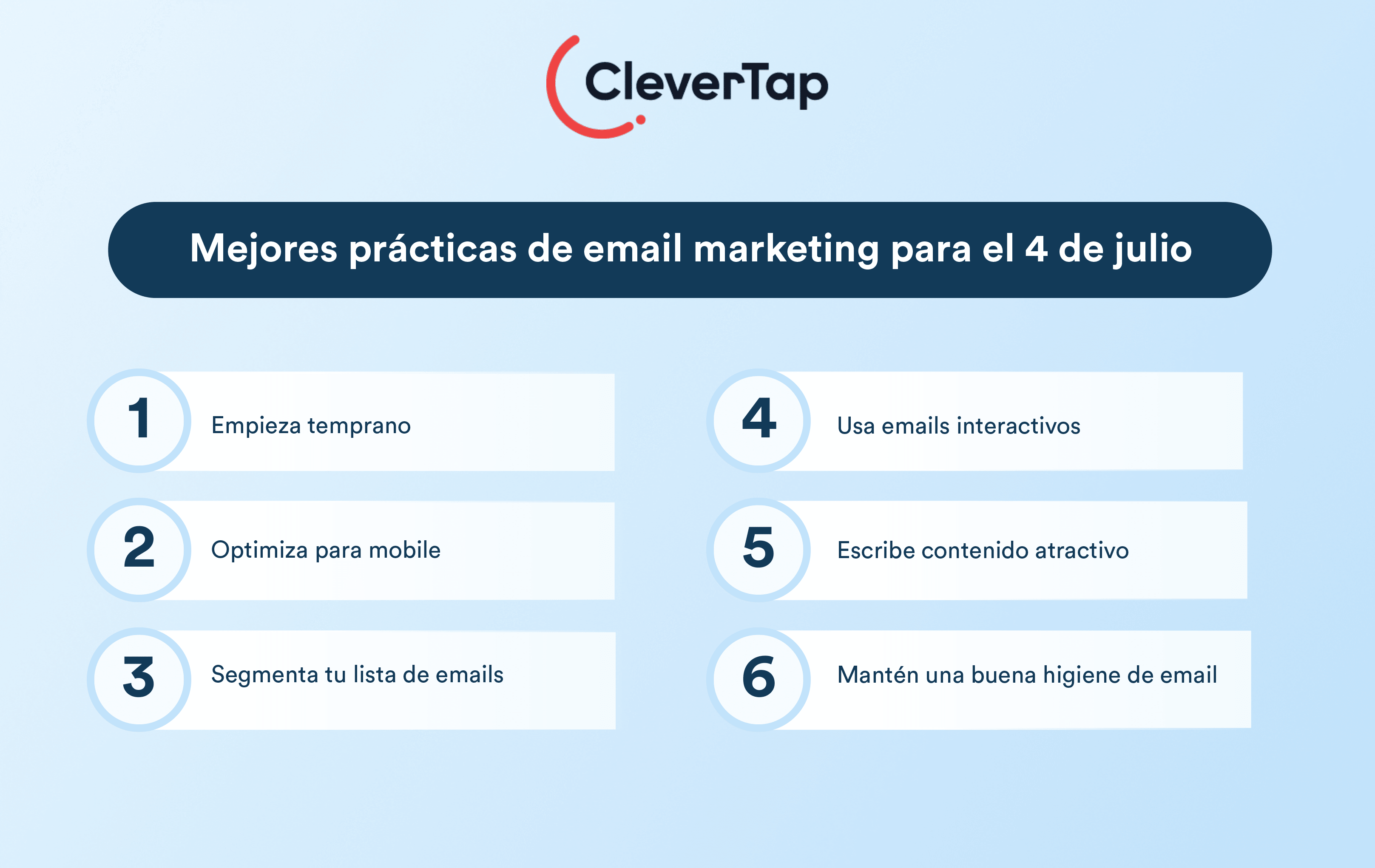 Escribe asuntos que generen curiosidad y urgencia. Usa paletas rojo, blanco y azul, fuegos artificiales y motivos americanos. Incorpora CTAs con espíritu festivo: “Declara tu descuento” o “Celebra con 30% OFF”. Prueba variaciones con A/B testing de CleverTap para detectar las creatividades que mejor convierten.