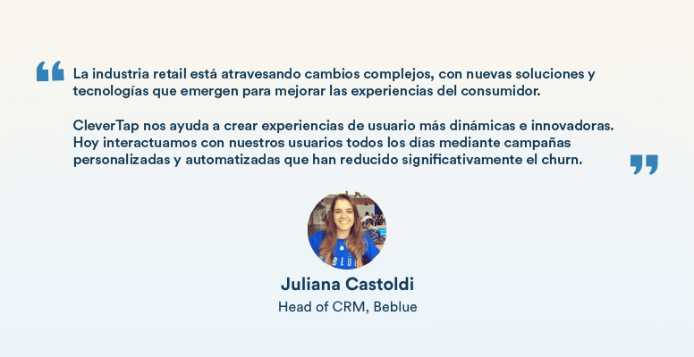 La app fintech Beblue utilizó la segmentación avanzada y estrategias personalizadas de notificaciones push de CleverTap para aumentar la frecuencia de transacciones. Al enviar recordatorios de cashback y ofertas de comercios locales en momentos de alta intención, registraron un aumento del 96% en usuarios activos diarios y un incremento del 16% en el Engagement de socios comerciales.