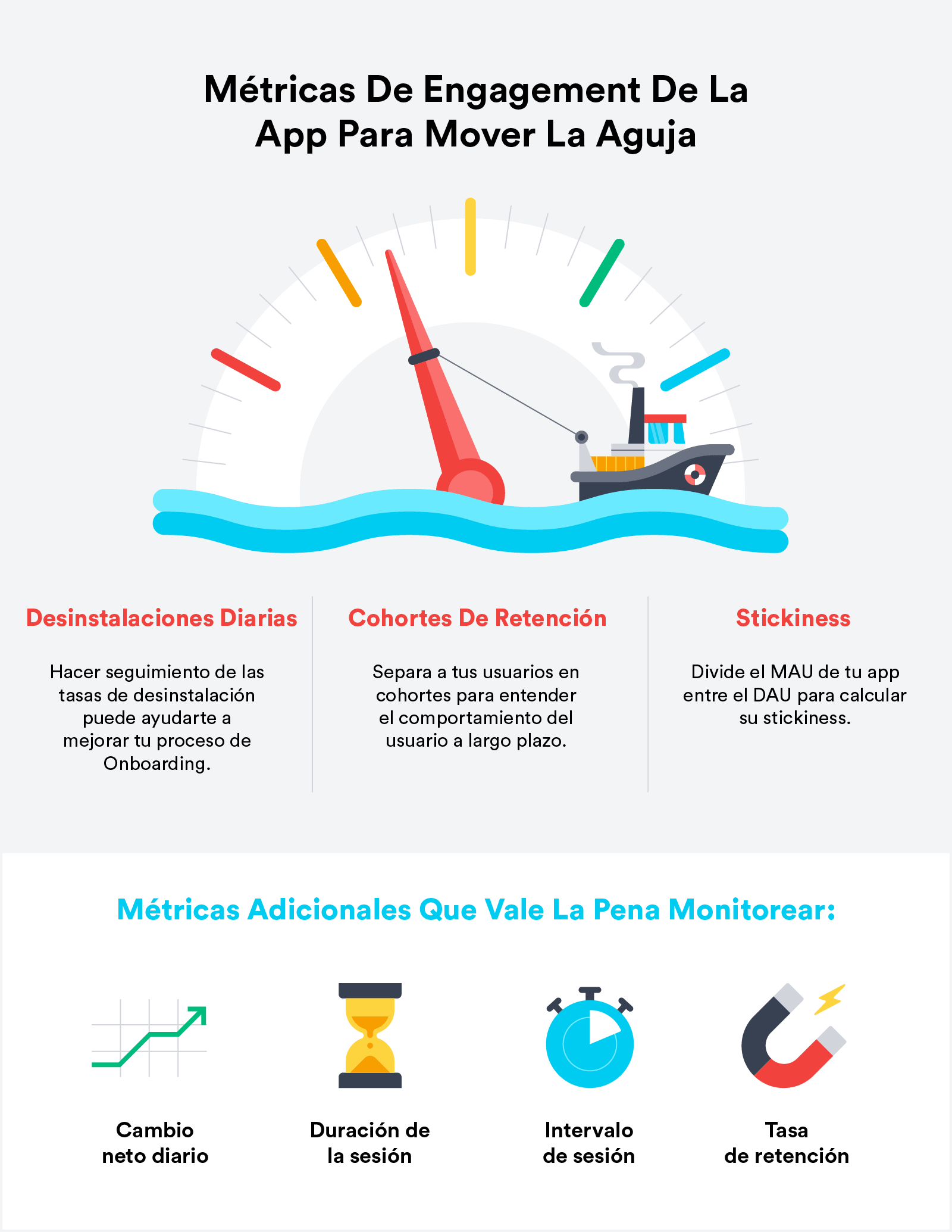 Además de tasas de desinstalación, cohortes de retención y usuarios activos, hay varias otras métricas de engagement del cliente en apps mobile que deberías monitorear.