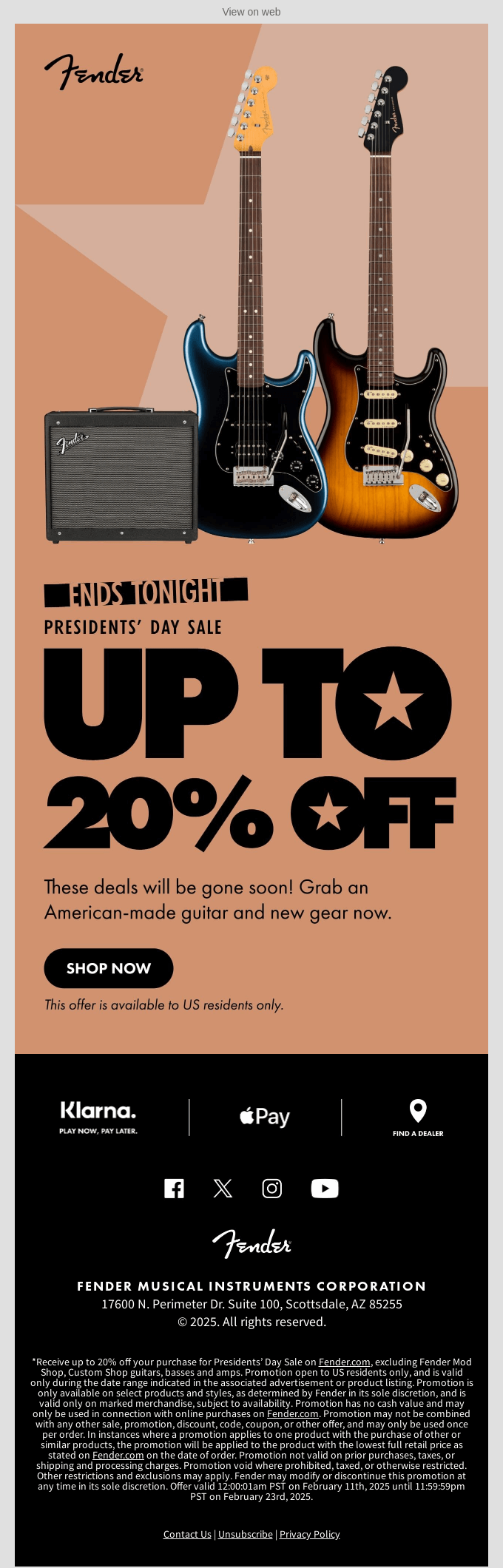 Fender’s “Ends Tonight: Presidents’ Day Sale” email strikes the perfect chord between heritage branding and urgency-driven design. The hero image of two iconic guitars and an amp takes center stage. The visual hierarchy is simple yet strong.