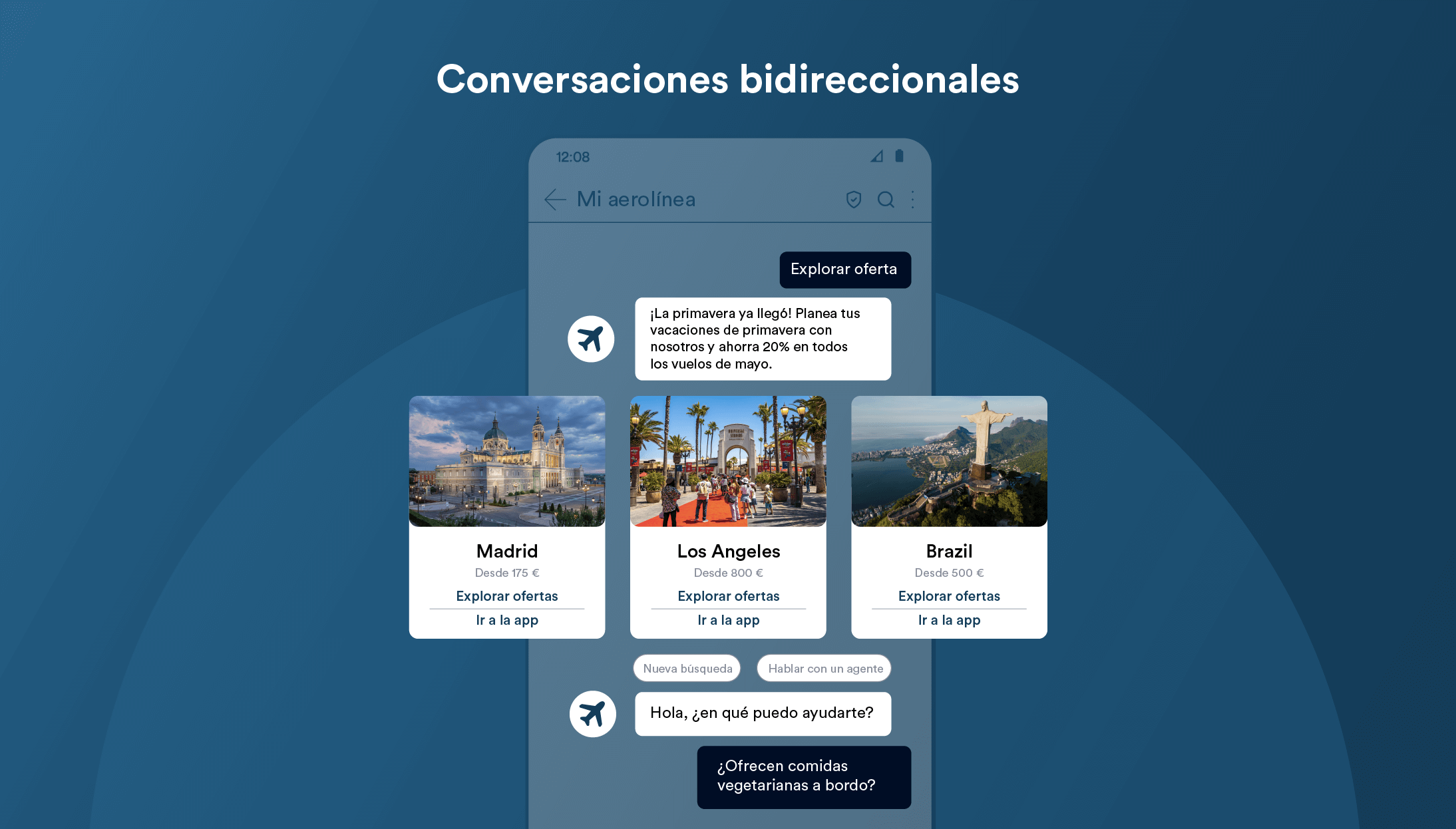 A diferencia de la mensajería empresarial tradicional, que suele ser una comunicación unidireccional, RCS permite que los clientes respondan a las marcas, creando una experiencia bidireccional e interactiva. Con chatbots impulsados por IA y automatización de soporte en tiempo real, las empresas pueden interactuar con los clientes mediante mensajería conversacional, habilitando interacciones fluidas sin necesidad de una app ni de una plataforma externa.