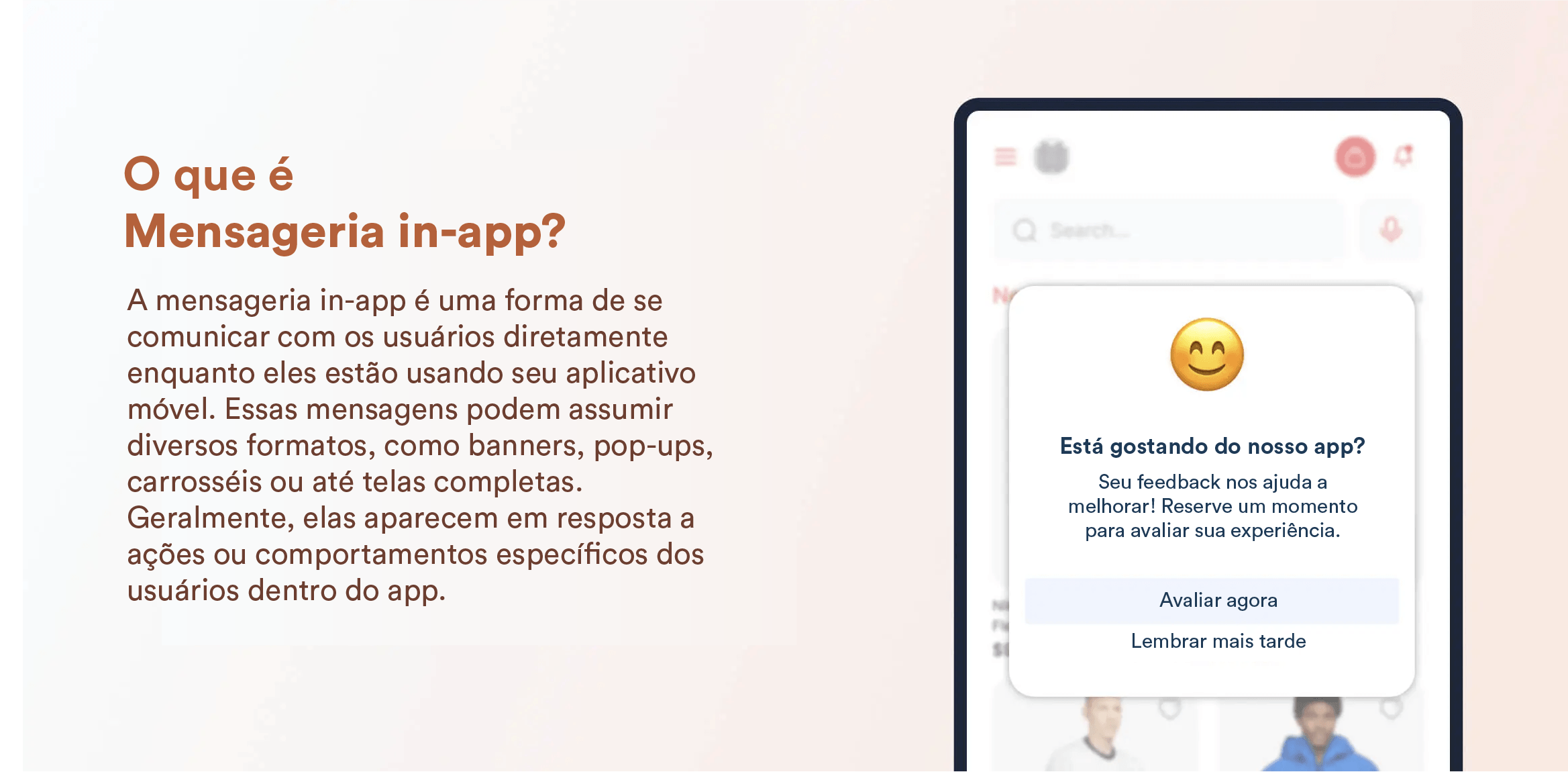 Ao contrário das Notificações Push, que alcançam os usuários fora do aplicativo e visam trazê-los de volta, as mensagens in-app aparecem apenas quando alguém já está ativo em seu aplicativo. Isso as torna menos intrusivas e mais relevantes, pois são acionadas pelo que os usuários estão realmente fazendo em tempo real. Como resultado, a mensagem in-app se tornou uma parte essencial das estratégias de engajamento mobile, permitindo que as marcas se conectem com os usuários em momentos-chave e impulsionem ações significativas.