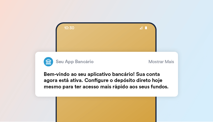 As notificações push desempenham um papel estratégico no Onboarding de novos usuários. Após o cadastro em uma conta bancária online, o cliente pode receber notificações orientando sobre funcionalidades do app, como configurar depósito automático ou vincular contas externas.