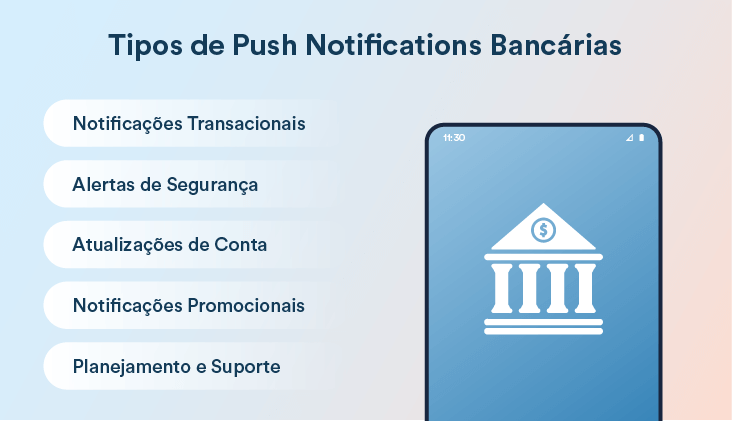 As notificações push no setor bancário podem ser classificadas em diferentes tipos, cada um atendendo a um propósito específico na melhoria da experiência bancária do cliente.