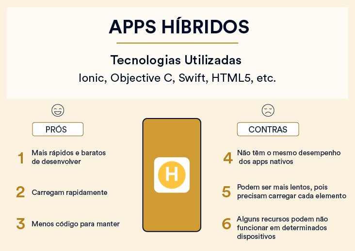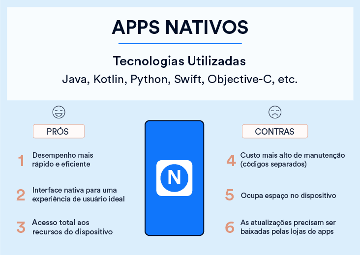 Prós: Devido ao seu foco singular, os aplicativos nativos têm a vantagem de serem mais rápidos e confiáveis em termos de desempenho. Eles geralmente são mais eficientes com os recursos do dispositivo do que outros tipos de aplicativos mobile. Aplicativos nativos utilizam a interface do usuário nativa do dispositivo, proporcionando aos usuários uma experiência do cliente mais otimizada.