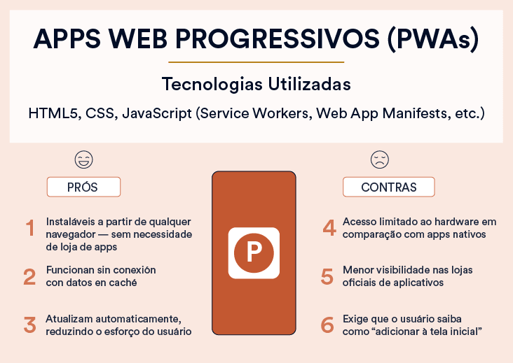 Progressive Web Apps (PWAs) merecem uma menção especial porque combinam o melhor dos aplicativos web e algumas capacidades de aplicativos nativos. Eles podem ser “instalados” na tela inicial de um dispositivo sem a necessidade de visitar uma loja de aplicativos, e podem funcionar offline ou em condições de rede ruins, armazenando dados em cache no navegador. PWAs também suportam notificação push, podem sincronizar em segundo plano e geralmente são leves. Alguns exemplos conhecidos incluem os PWAs da Starbucks e do Pinterest.