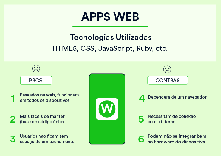 Contras: Mas isso também é pertinente: os aplicativos web dependem inteiramente do navegador usado no dispositivo. Haverá funcionalidades disponíveis em um navegador e não disponíveis em outro, possivelmente proporcionando aos usuários experiências variadas. Além disso, os aplicativos web não funcionarão completamente offline. Mesmo que tenham um modo offline, o dispositivo ainda precisará de uma conexão com a internet para fazer backup dos dados em seu dispositivo, oferecer novos dados ou atualizar o que está na tela.