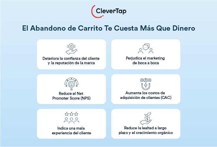 Sorprendentemente, los carritos abandonados cuestan más que solo ingresos: también pueden deteriorar activos intangibles como la confianza del cliente y la reputación de la marca. Es un efecto dominó: cuando los usuarios abandonan por malas experiencias, pueden perder interés en tu marca o sentirse frustrados.