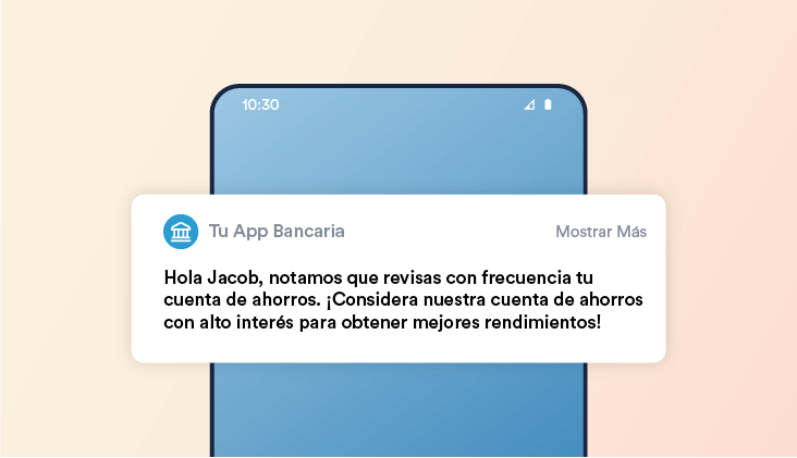 Ejemplo: Una notificación podría indicar: “Hola [Nombre Del Usuario], notamos que consulta con frecuencia su cuenta de ahorros. Considere nuestra cuenta de ahorro con alto rendimiento para obtener mejores beneficios”. Este enfoque personalizado hace que los usuarios se sientan valorados y comprendidos.