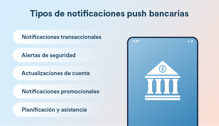 Las notificaciones push en banca se presentan en distintos tipos, cada uno con un propósito específico para mejorar la experiencia bancaria del cliente.