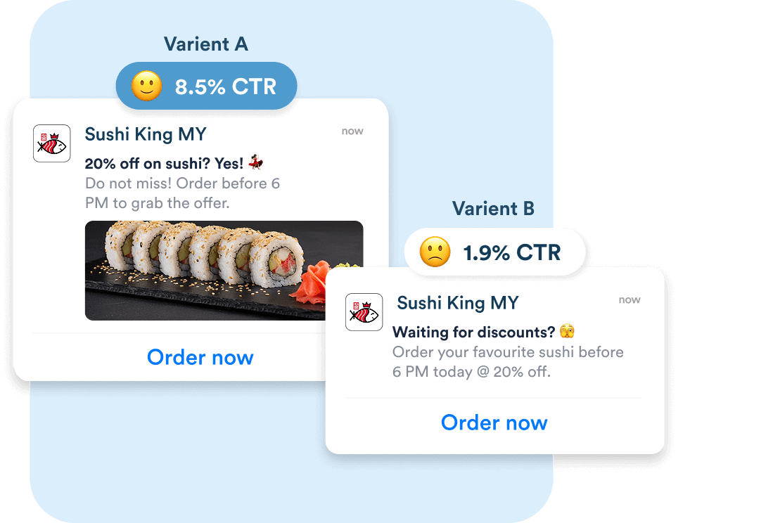 To maximize reach and impact, Sushi King’s campaigns span email and push notifications. With CleverTap, Sushi King optimizes channel distribution with insights such as emails driving the highest conversion rates, while push notifications spark quick awareness and immediate actions.