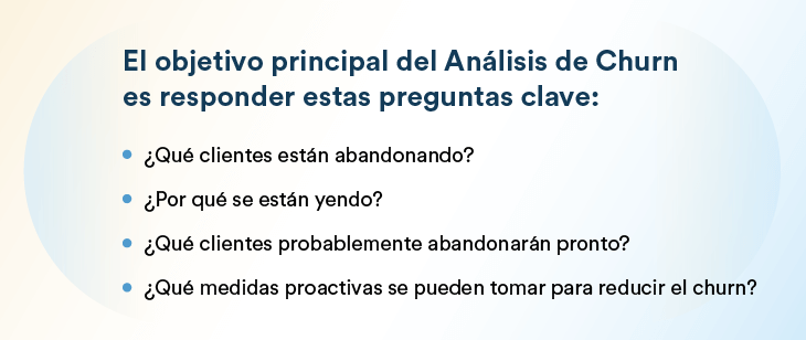 Un análisis de churn eficaz va más allá de calcular la tasa de abandono: ayuda a descubrir las motivaciones detrás de las decisiones del cliente y a predecir comportamientos futuros basándose en datos históricos.