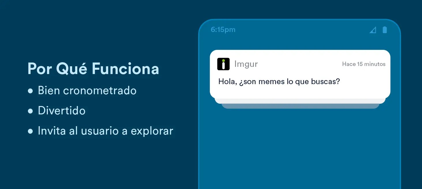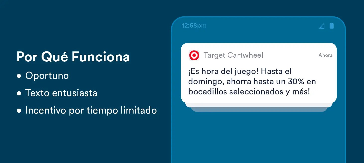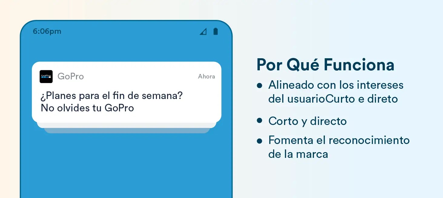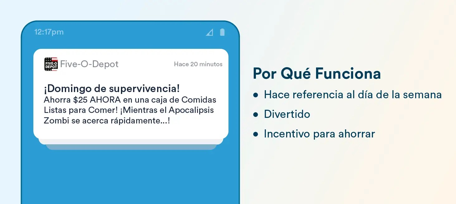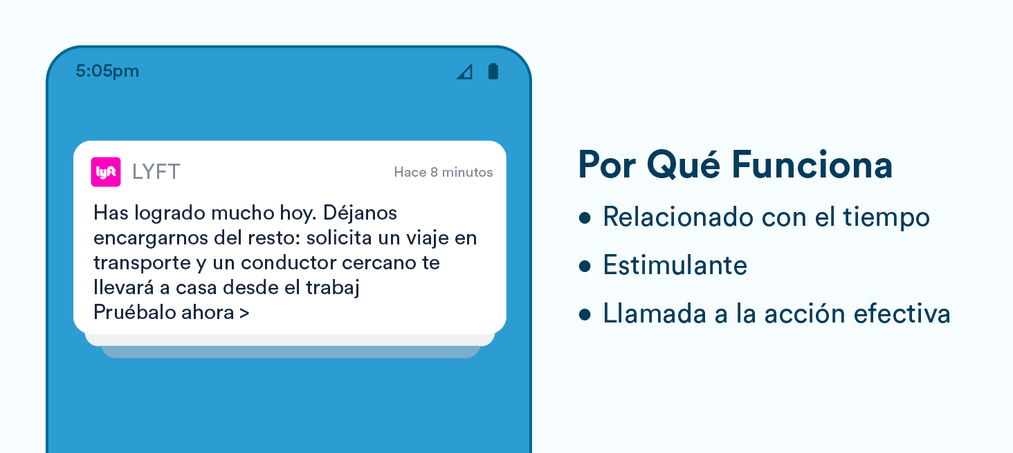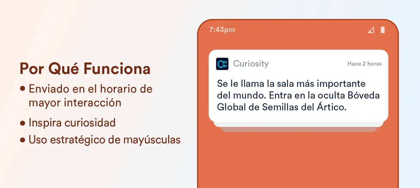 Oportuna: Este mensaje fue enviado en un horario de uso pico de smartphones (después del trabajo). Utiliza un mensaje atractivo para inspirar curiosidad y destacar entre las demás notificaciones enviadas en ese momento.