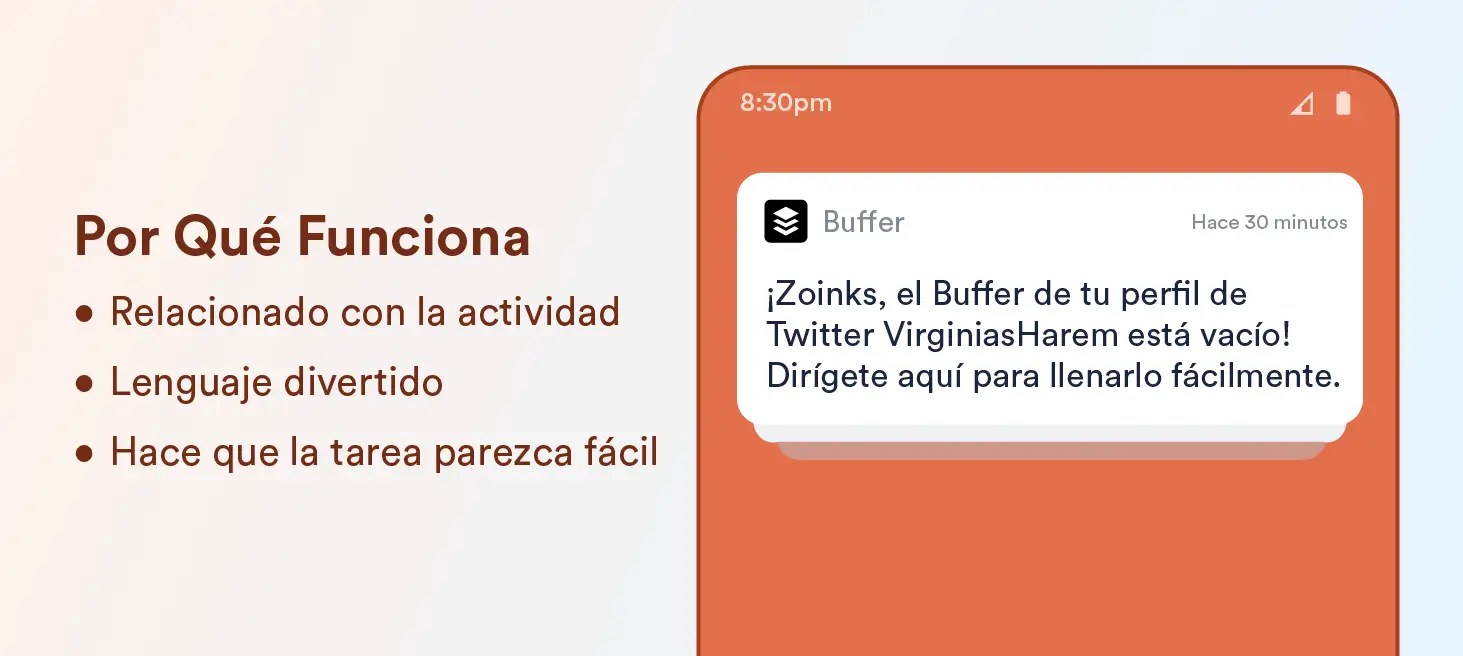 La frase “¡Es hora!” crea urgencia. El usuario puede pensar: “¡Será mejor que lo haga ahora antes de que se me olvide!”