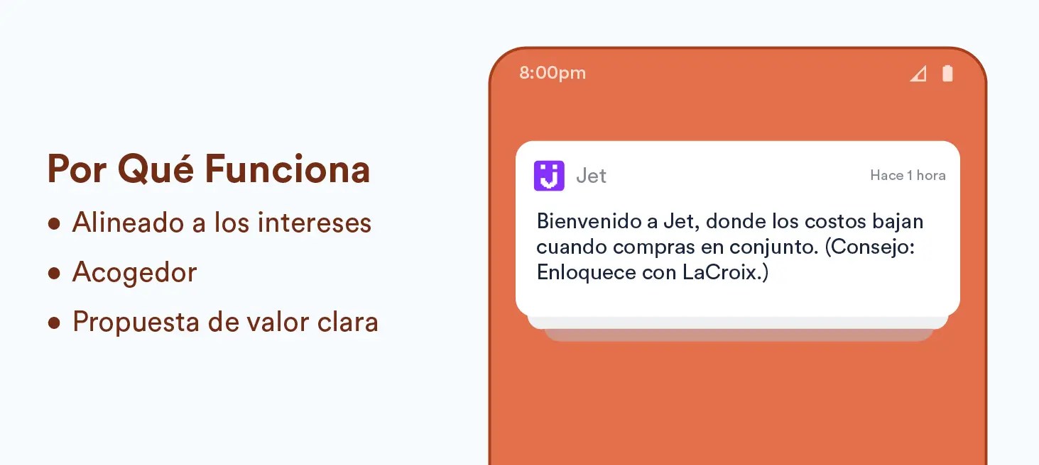 Oportuno: Alguien del equipo CleverTap recibió esta notificación el mismo día que instaló Jet y exploró la app durante unos minutos. Fue la primera notificación que Jet envió. ¡Bastante puntual!