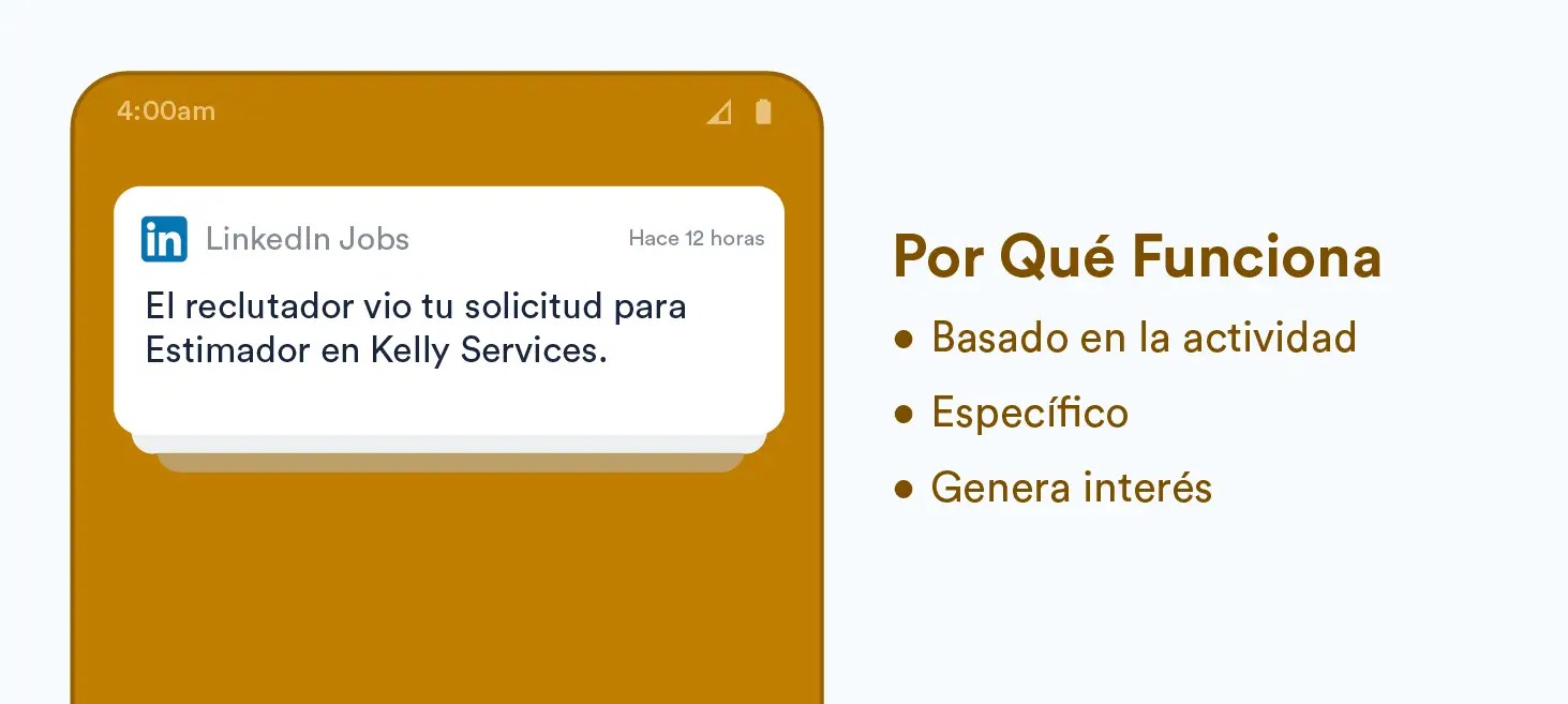 Accionable: No hay una llamada a la acción específica, pero saber que un empleador vio la solicitud podría animar al usuario a hacer clic para obtener más información o ver otras notificaciones relevantes.