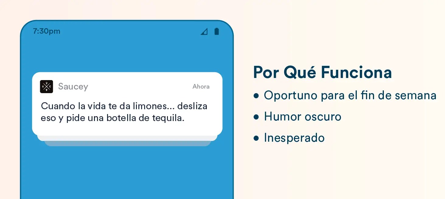 Oportuno: Probablemente Saucey envió esta notificación justo antes del fin de semana, sabiendo que sus usuarios probablemente buscan formas de relajarse y divertirse.