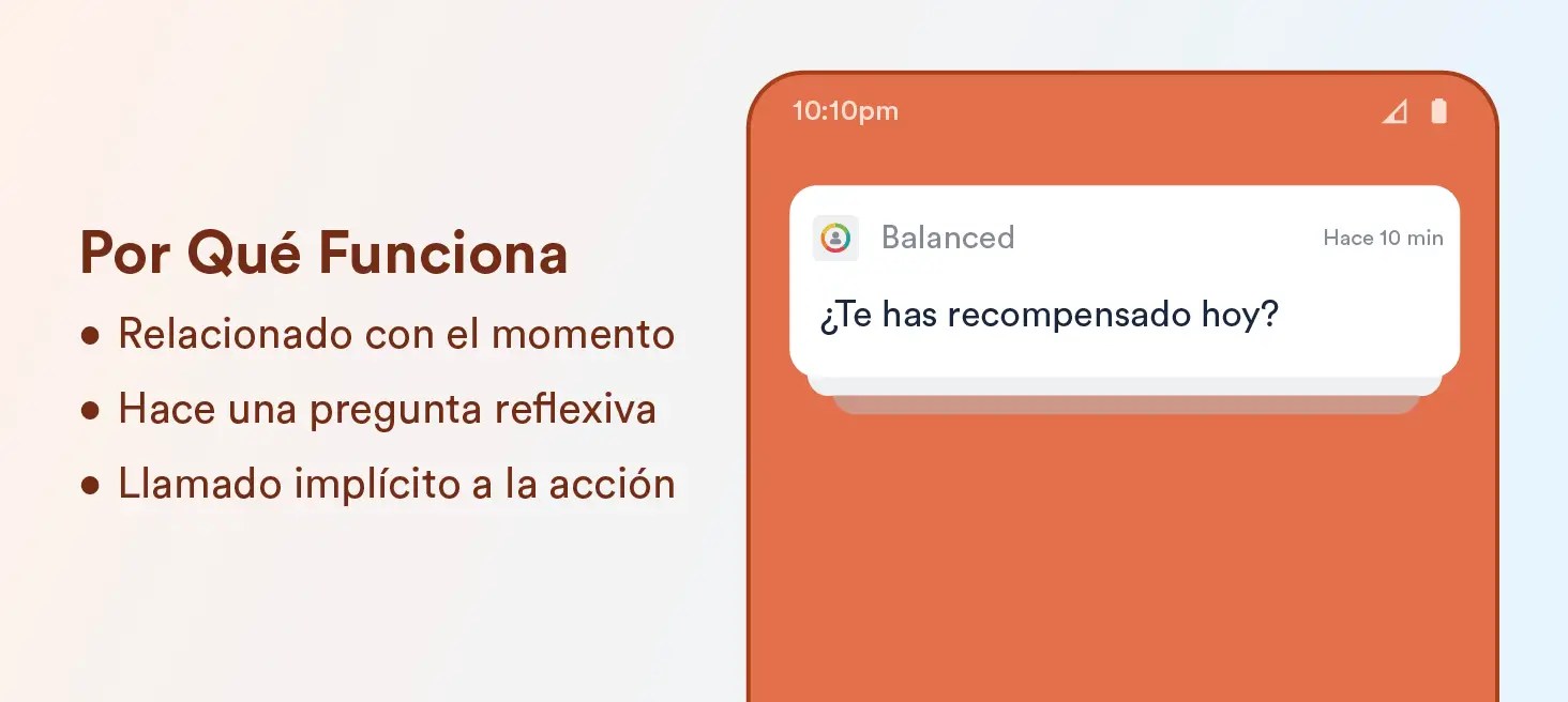 Accionable: Esta es una solicitud implícita. Balanced confía en que el usuario querrá responder a la pregunta planteada, lo que lo motivará a hacer clic. (Un enfoque más directamente accionable podría ser algo como: “¿Te has recompensado hoy, Ana? Adelante; ¡te lo mereces!”)