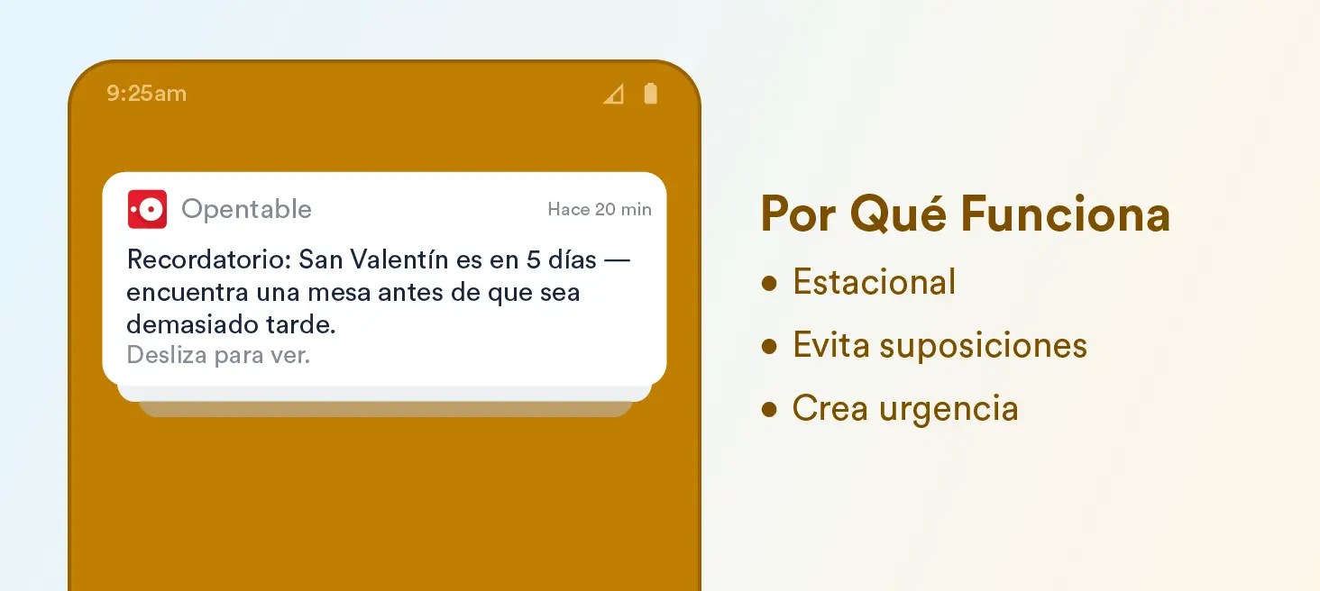 Personal: Si el usuario está planeando una cena para San Valentín, este mensaje es lo suficientemente personal. Aun así, el texto directo evita sabiamente asumir que el usuario tiene planes románticos. ¡Quizás se trate de un plan de amigos!