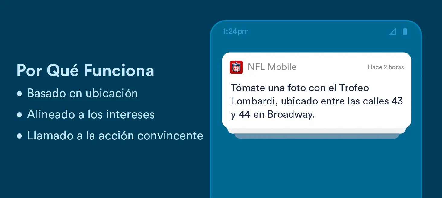 - Es relevante y oportuna: El comportamiento, la ubicación o las preferencias del usuario activan la notificación. Las notificaciones push basadas en la ubicación son minas de oro en tiempo real si las diseñas de manera atractiva para tu audiencia.
