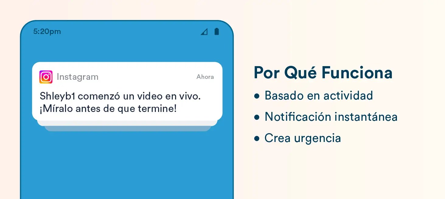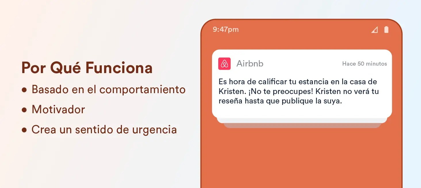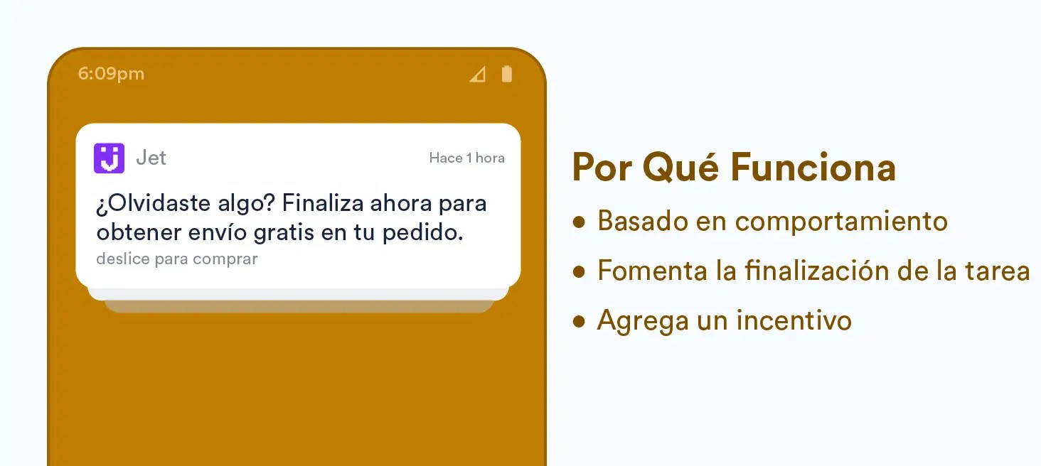 Oportuno: Esta es una notificación push basada en comportamiento, enviada después de que el usuario no haya tomado ninguna acción por un período de tiempo determinado.