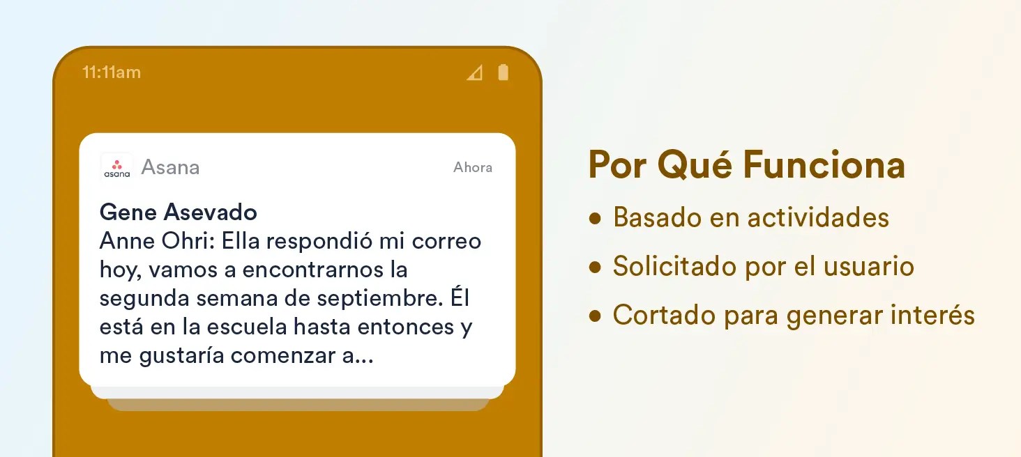 Al dar una vista previa truncada del contenido del mensaje, Asana involucra al usuario y lo motiva a responder. Aunque algunos usuarios puedan desactivar notificaciones como estas en nombre del equilibrio entre la vida personal y laboral, los usuarios que las activen apreciarán la inmediatez.