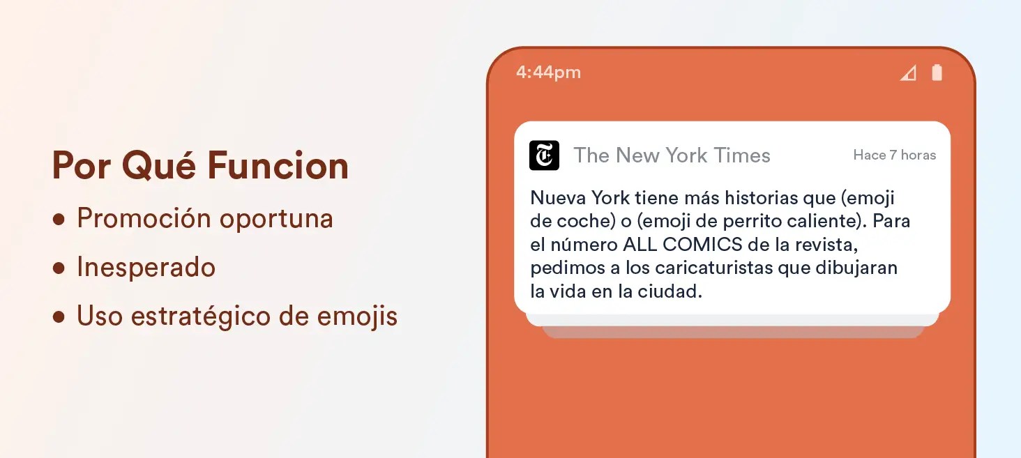 El uso desenfadado de emojis para reemplazar palabras en esta notificación hace que se destaque, considerando la imagen más seria de la marca NYT. ¡Y el usuario pasará algunos segundos descifrando el mensaje en su mente! (¡Es cierto que Nueva York tiene muchos taxis y perritos calientes!)