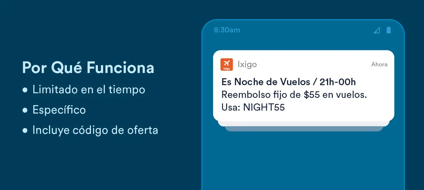Esta notificación se envió a las 8:30 a.m. para promocionar una oferta de vuelos del mismo día a las 21h. También despierta un poco de FOMO: no querrás perderte esta oferta de reembolso.