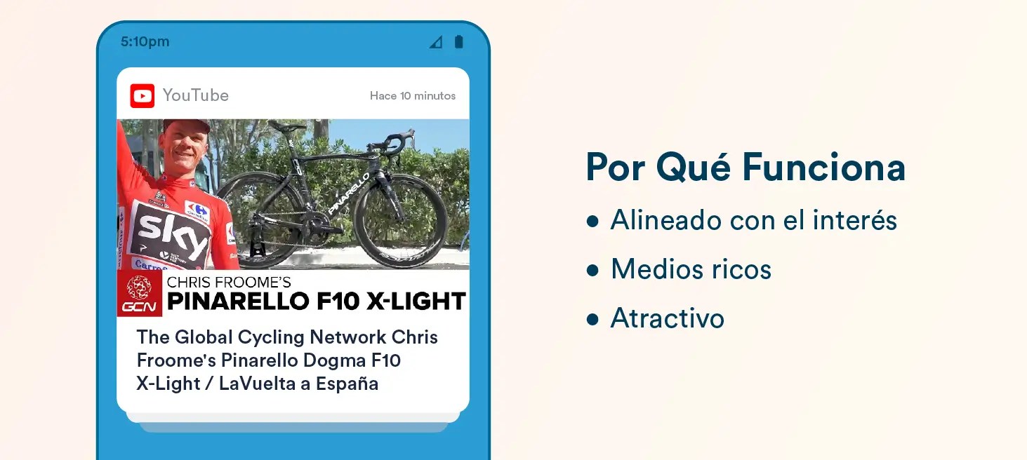 El usuario se ha suscrito a canales de ciclismo en YouTube. Eso significa que probablemente estará interesado en contenido fresco sobre carreras, equipo y ciclistas.
