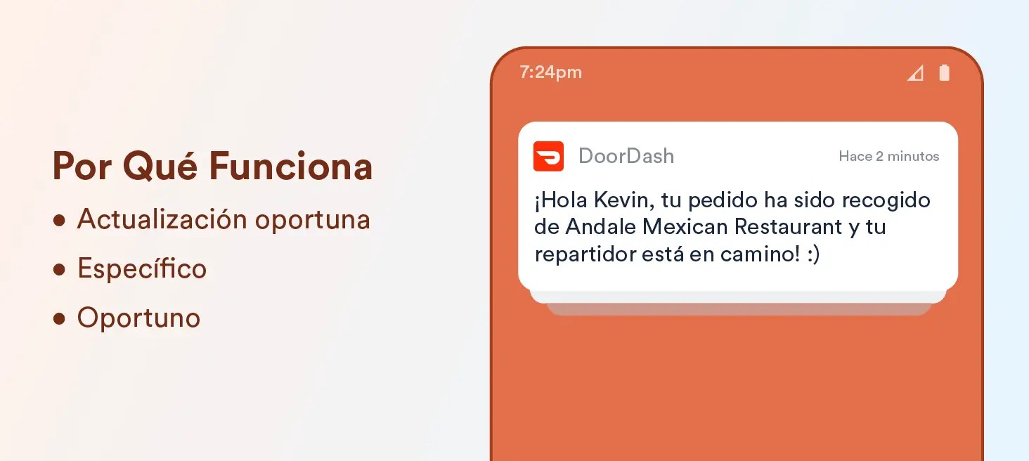 DoorDash actualiza al usuario cuando su comida está en camino, para que esté listo y esperando por ella. Este tipo de notificaciones llena el vacío entre hacer el pedido y esperar el toque en la puerta, ayudando a los usuarios a sentirse más informados.