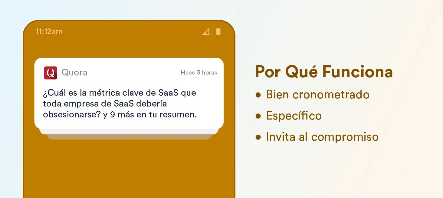 La notificación hace referencia al resumen ya existente del usuario e informa exactamente cuántos artículos están guardados para que los lea. También es relevante para los intereses que ha mostrado al usar la aplicación de Quora.