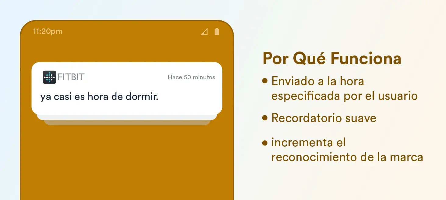 Personalizado: Como Fitbit tiene información sobre el horario de dormir del usuario, la app puede enviar una notificación que se siente como un recordatorio amistoso. Agregar el nombre del usuario haría la notificación aún más personal, pero no se puede negar su simplicidad.