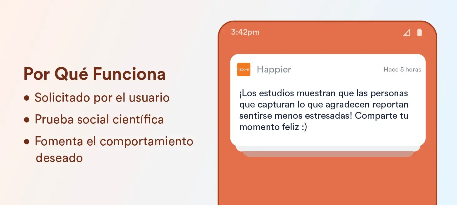 Personal: Happier quiere que compartas un poco de gratitud y te anima con un mensaje que no tiene puntuación final (como la mayoría de los mensajes personales de texto) e incluye un emoticono sonriente amigable. La prueba social detrás de las palabras “los estudios muestran” promete que compartir un momento de gratitud ayudará al usuario a sentirse menos estresado.