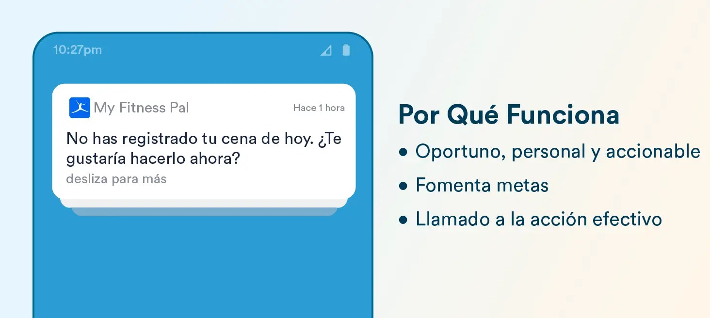 Oportuno: Este mensaje se envía después de la cena, si el usuario no ha interactuado con la app para registrar lo que comió. La palabra capitalizada selectivamente — “Cena” — resalta en el texto mientras el usuario escanea. (La capitalización selectiva es una buena práctica de notificación push que veremos a continuación.)
