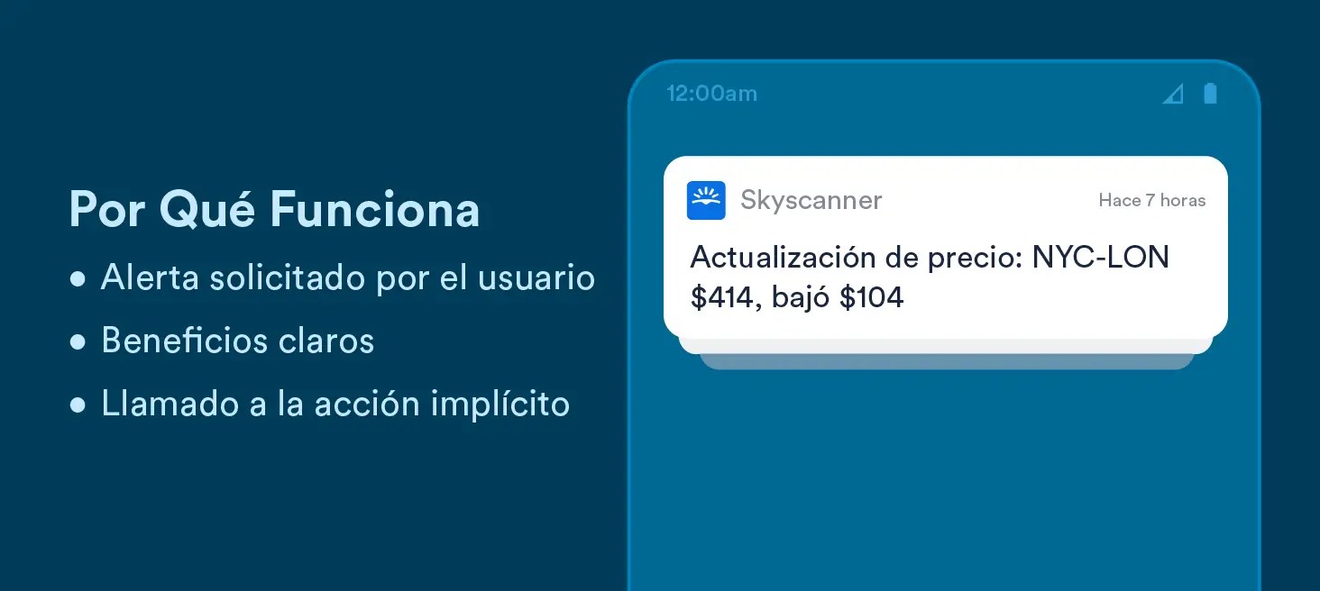 Accionable: Si la oferta parece buena, el usuario puede abrir la app y reservar el vuelo. Y aunque no sea así, puede hacer clic para configurar una nueva alerta o explorar alternativas. De cualquier manera, Skyscanner ha agregado valor y ha ganado su lugar como una app que vale la pena mantener.