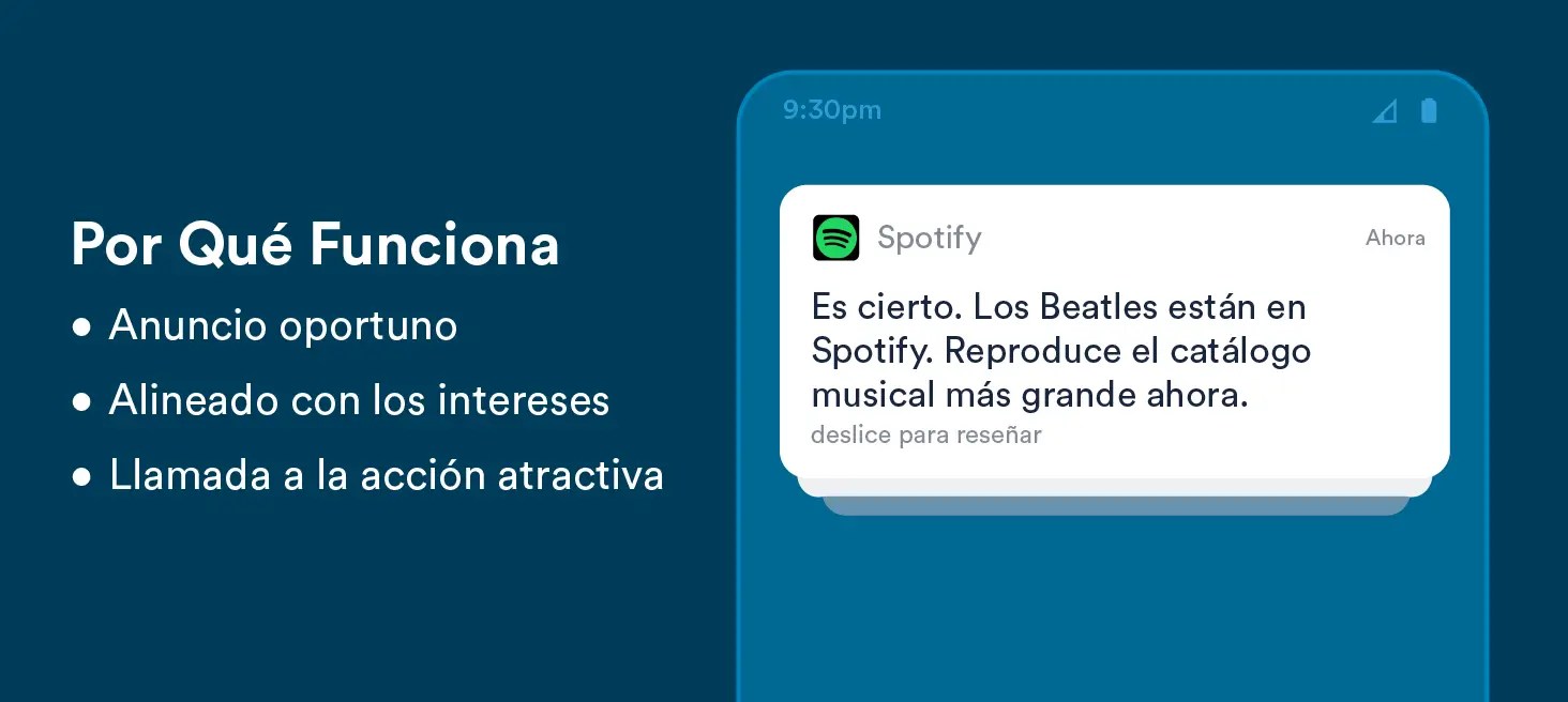 Personal: Es probable que los usuarios que recibieron esta notificación escuchen música como “rock clásico” o “viejos éxitos”, lo que hace que esta notificación sea personalizada a sus gustos.