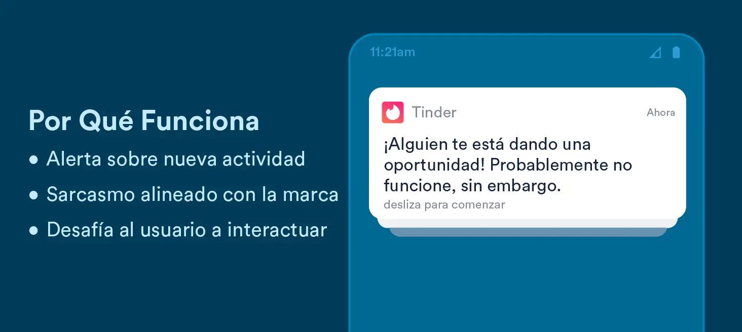 Accionable: Al decir “probablemente no funcione,” Tinder lanza un reto y desafía al usuario a pensar: “¿Ah sí? ¡Ya veremos!” Ya sea que el match potencial funcione o no, es probable que el usuario sienta curiosidad por la “nueva persona” y abra la app.
