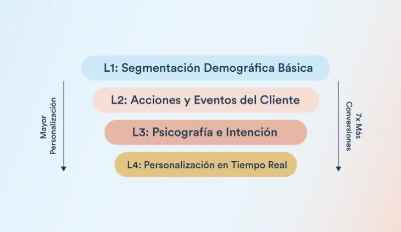 • Nivel 4: aprovecha datos en tiempo real para activar mensajes inmediatos y relevantes (productos en tendencia, ofertas limitadas), generando urgencia y mayor conversión.