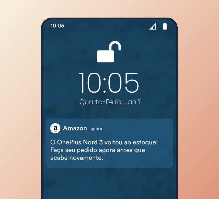 Uma notificação de reposição de estoque informa os usuários que um item anteriormente esgotado está disponível novamente. Essas notificações reengajam usuários que demonstraram interesse no produto, criando entusiasmo e urgência para a compra.
