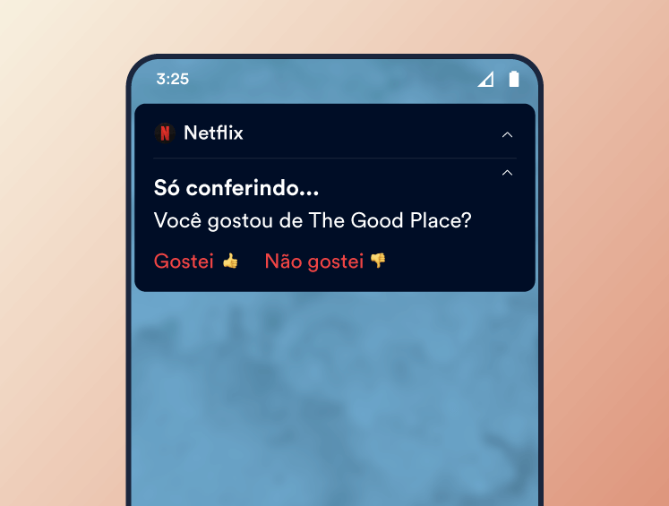 Uma notificação de feedback do usuário solicita a opinião dos assinantes sobre conteúdos consumidos recentemente, como uma série ou playlist. Essas notificações fornecem insights valiosos enquanto reengajam usuários com interações personalizadas.