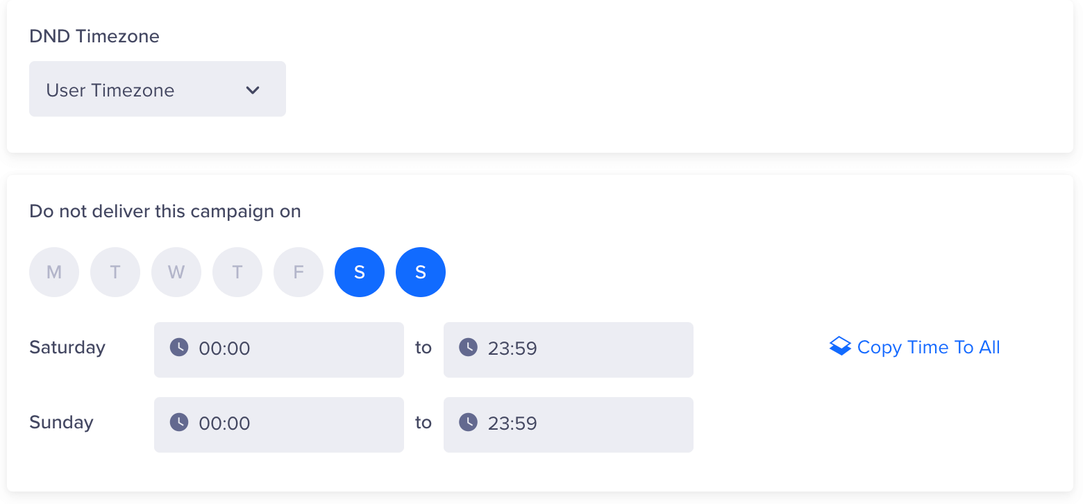 CleverTap permite definir en qué horarios no enviar notificaciones. Lo puedes configurar para cumplir con los requisitos de la ley. El horario de “no molestar” puede establecerse teniendo en cuenta la zona horaria de cada usuario. Asimismo, puedes decidir descartar las notificaciones que se enviarían en este horario, o elegir enviarlas luego de que el mismo termine.