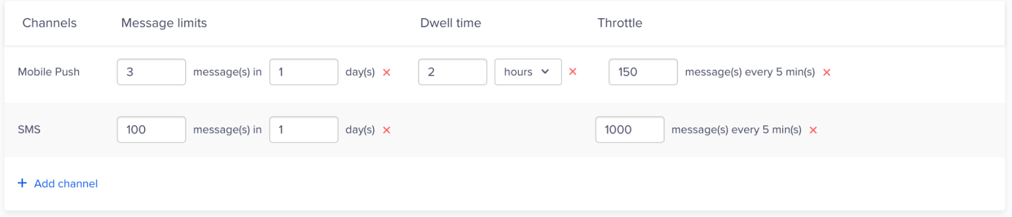 Puedes limitar el número máximo de mensajes que un usuario puede recibir en un canal en particular. Esto está disponible para múltiples canales, y solo debes configurarlo una vez para que se active en tus campañas futuras.