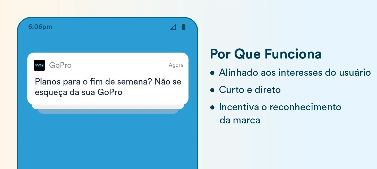 Pessoal: O push sugere que uma pessoa que possui uma GoPro teria planos para o fim de semana emocionantes o suficiente para precisar ser filmado. Também nutre o relacionamento existente do usuário com a marca, lembrando-o de levar seu amigo, a câmera GoPro, em suas aventuras.