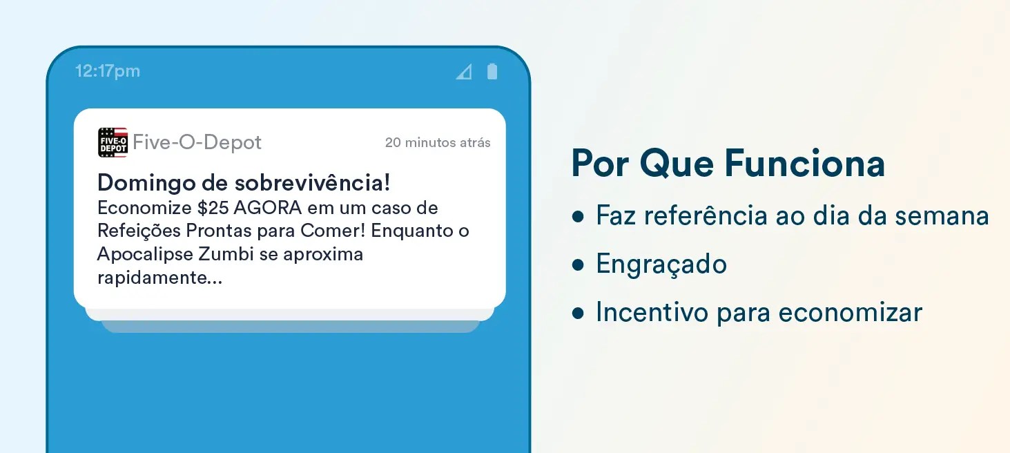 Oportuno: Esta mensagem foi enviada em um horário de pico para uso de smartphones (após o trabalho). Ela utiliza uma mensagem envolvente para inspirar curiosidade e se destacar entre as demais notificações enviadas nesse horário.