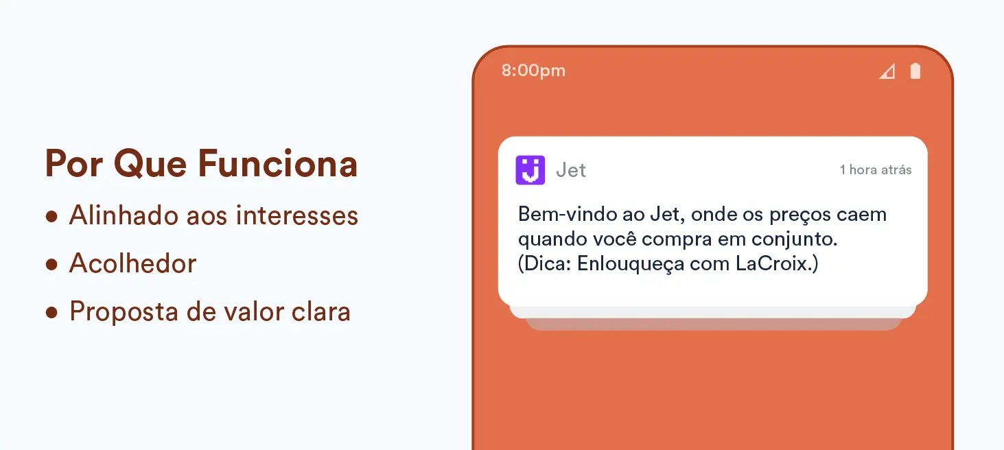 Oportuno: Alguém da equipe CleverTap recebeu essa notificação no mesmo dia em que instalou o Jet e explorou o app por alguns minutos. Foi a primeira notificação enviada pelo Jet. Bem pontual!
