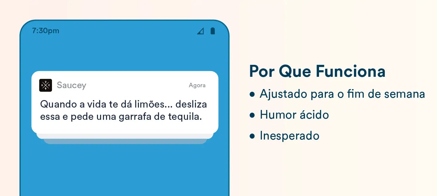 Oportuno: A Saucey provavelmente enviou essa notificação pouco antes do fim de semana, sabendo que seus usuários provavelmente estão buscando formas de relaxar e se divertir.